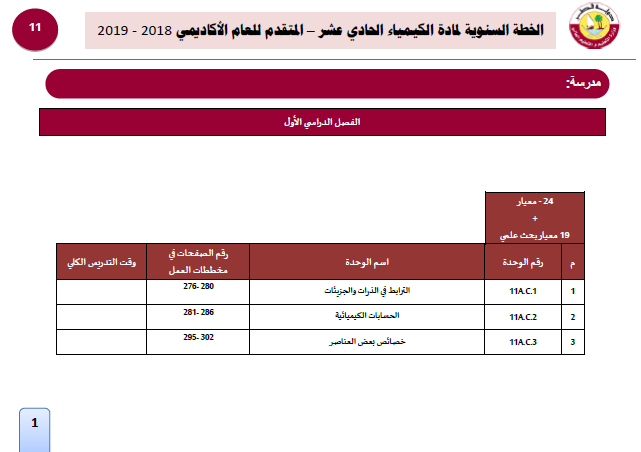 الخطه السنويه لمادة الكيمياء الصف الحادي عشر المتقدم المنهاج القطري 2018 - 2019