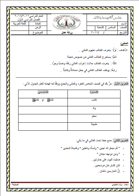 دوسية أوراق عمل لمادة اللغة العربية للصف السادس الفصل الأول 2018 لتحميل الملف PDF اضغط هنا وتابع