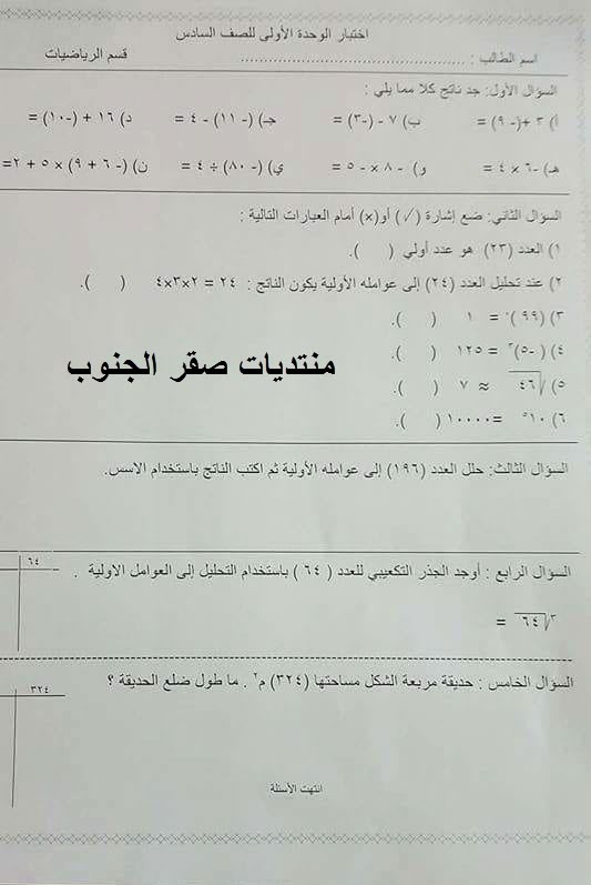 بالصور نموذج اختبار الوحدة الاولى لمادة الرياضيات الصف السادس الفصل الاول
