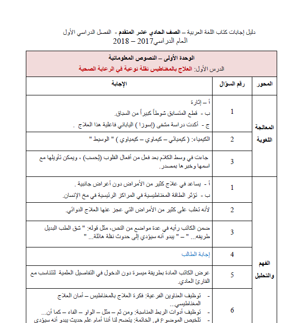 دليل اجابات كتاب مادة اللغه العربيه الصف الحادي عشر المتقدم الفصل الأول المنهاج القطري 2018 - 2019