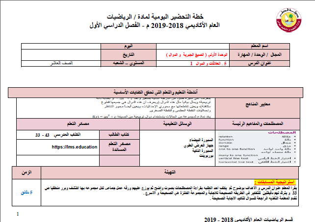 الخطة التحضير اليوميه لمادة الرياضيات الصف العاشر الفصل الأول المنهاج القطري 2018 - 2019