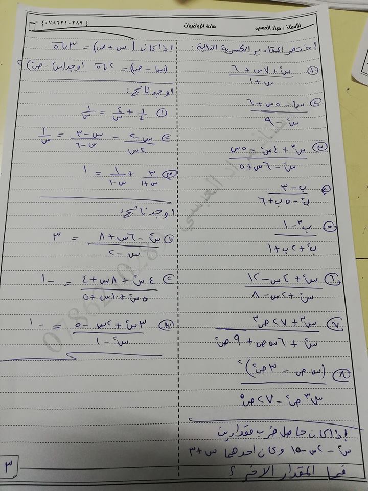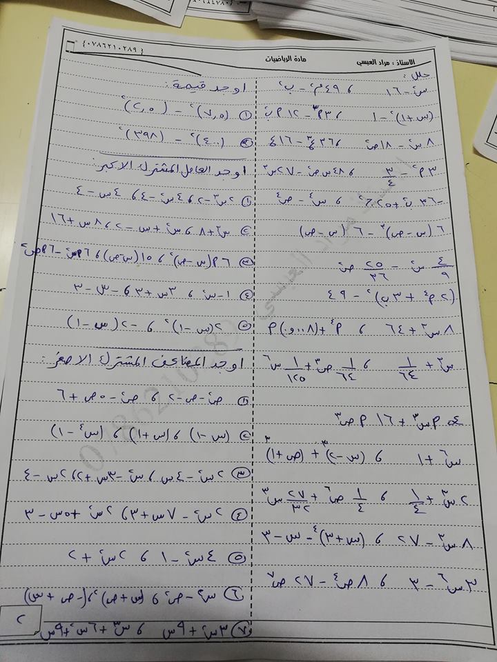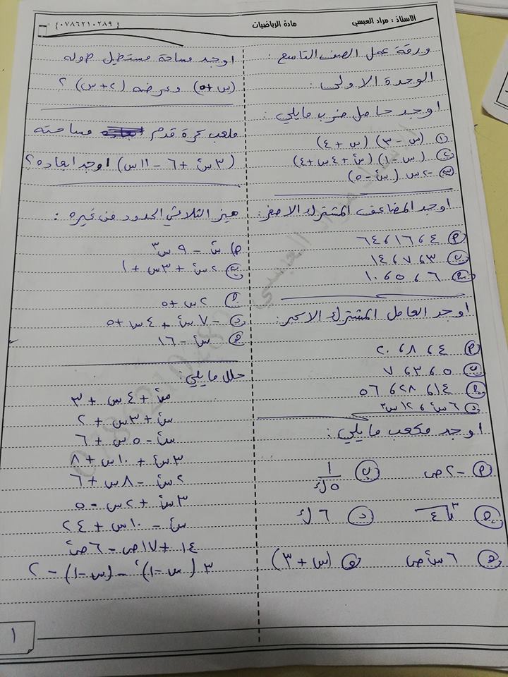 أوراق عمل شاملة الوحدة الأولى لمادة الرياضيات للصف التاسع الفصل الأول
