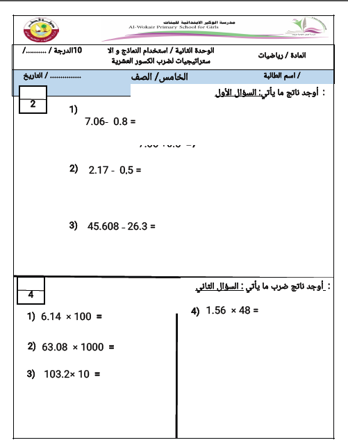 تدريبات إثرائية الوحدة الثاني مادة الرياضيات لصف الخامس الابتدائي الفصل الأول المنهاج القطري