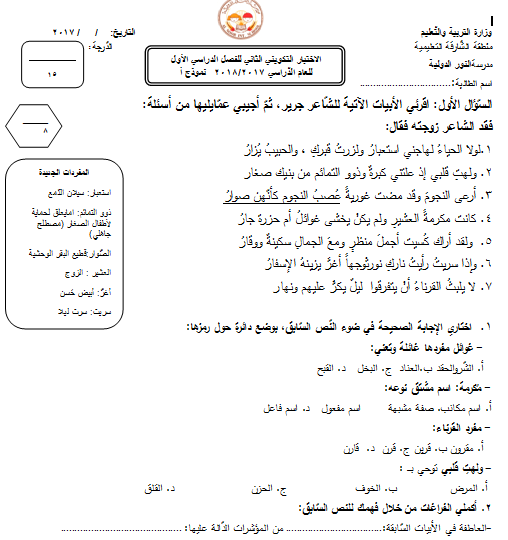 الاختبار التكويني الثاني للفصل الدراسي الأول لماده اللغة العربية نموذج 1