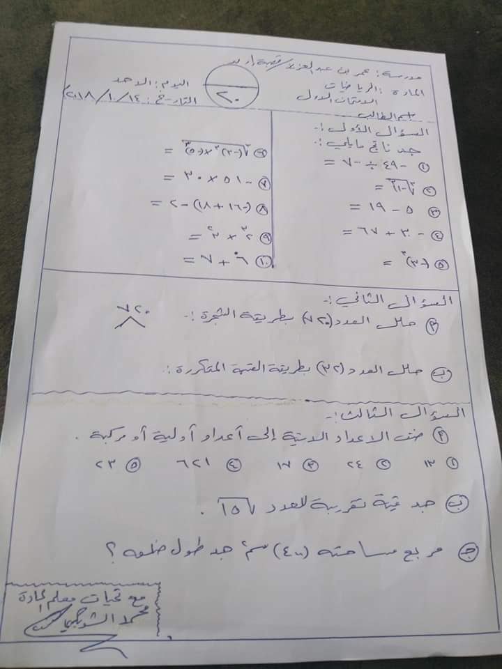 نموذج اختبار الشهر الأول لمادة الرياضيات للصف السادس الفصل الأول مع الإجابة