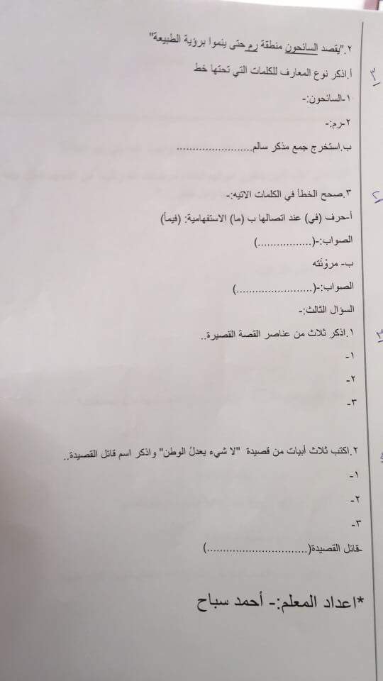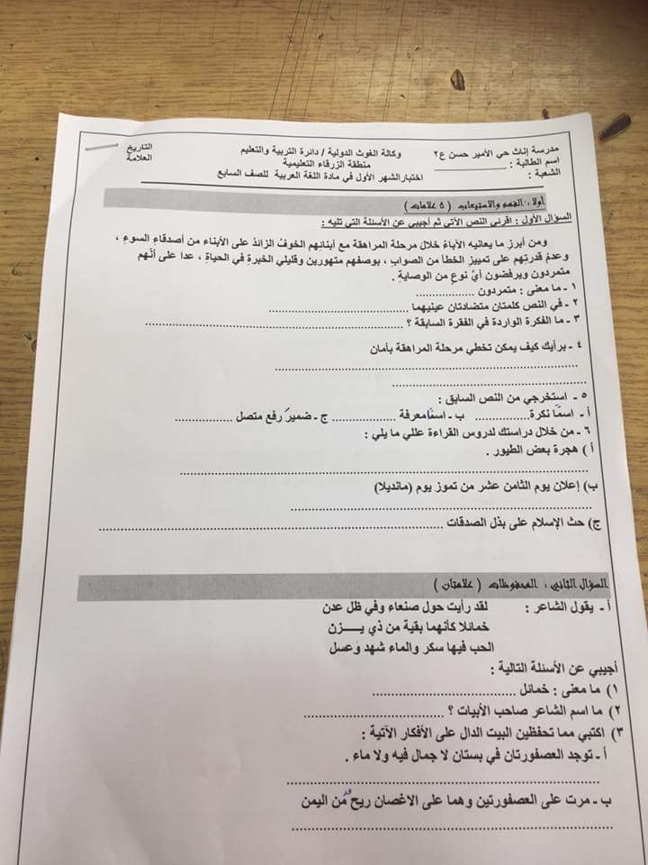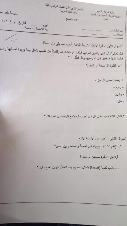 نماذج لاختبار الشهر الأول لمادة اللغة العربية للصف السابع الفصل الأول