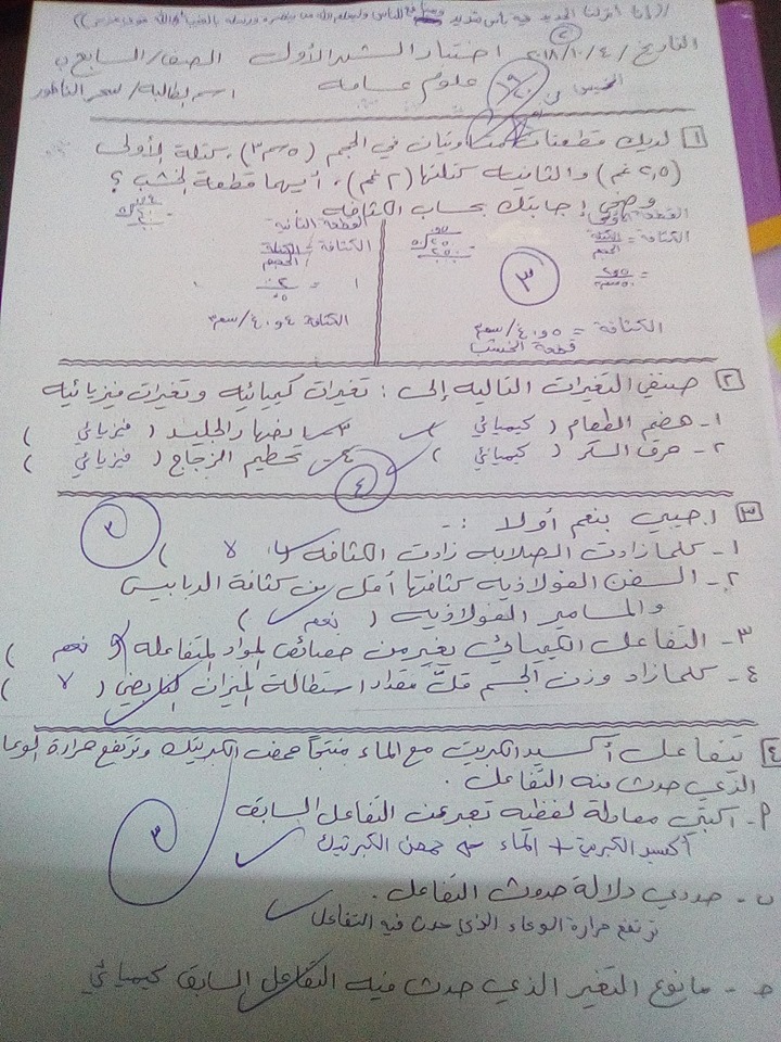 نموذج لاختبار الشهر الأول لمادة العلوم للصف السابع الفصل الأول