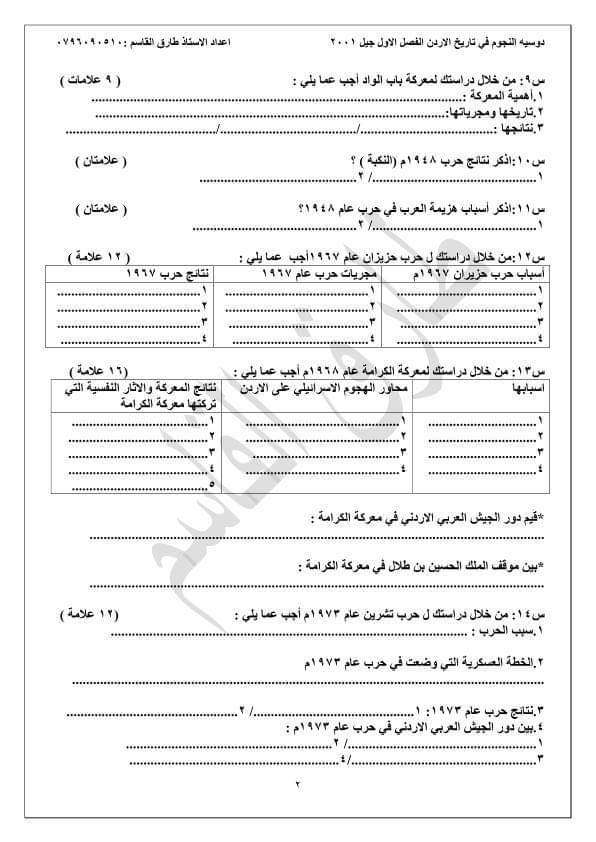 التوجيهي:اختبار الوحدة الثالثة:الأردن والقضية الفلسطينية لمادة تاريخ الأردن للصف الثاني ثانوي مشترك