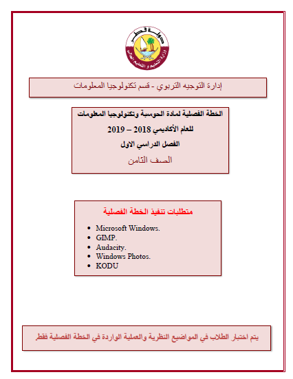 الخطه الفصليه لمادة الحوسبه وتكنولوجيا المعلومات لصف الثامن الفصل الأول المنهاج القطري 2018 - 2019