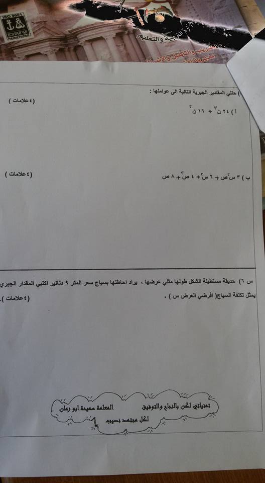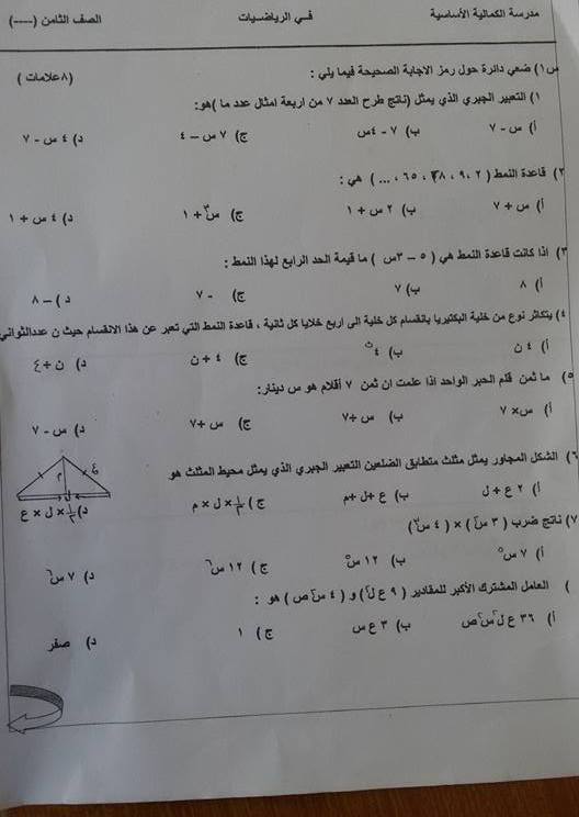 نموذج لاختبار الشهر الثاني لمادة الرياضيات للصف الثامن- الفصل الأول