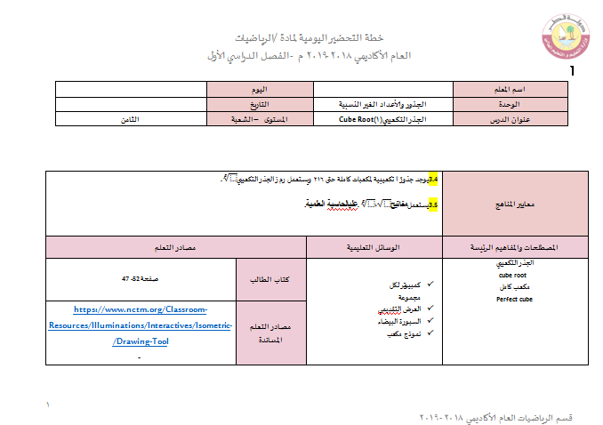 خطة التحضير اليوميه الجذر التكعيبي لمادة الرياضيات الصف الثامن الفصل الأول المنهاج القطري 2018 - 2019