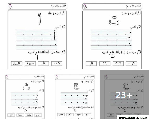 بالصور + ملف PDF دوسية تحتوي على 27 صفحة أوراق عمل لتثبيت الحروف تلوين ..كتابة..ربط للصف الاول الفصل الاول