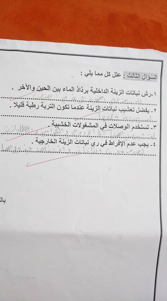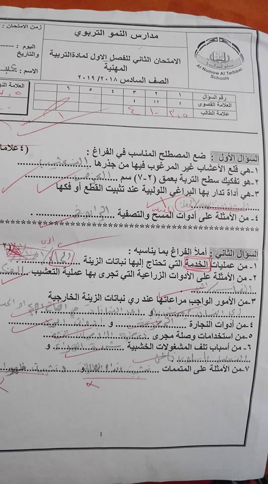نموذج لاختبار الشهر الثاني لمادة التربية المهنية للصف السادس الفصل الأول