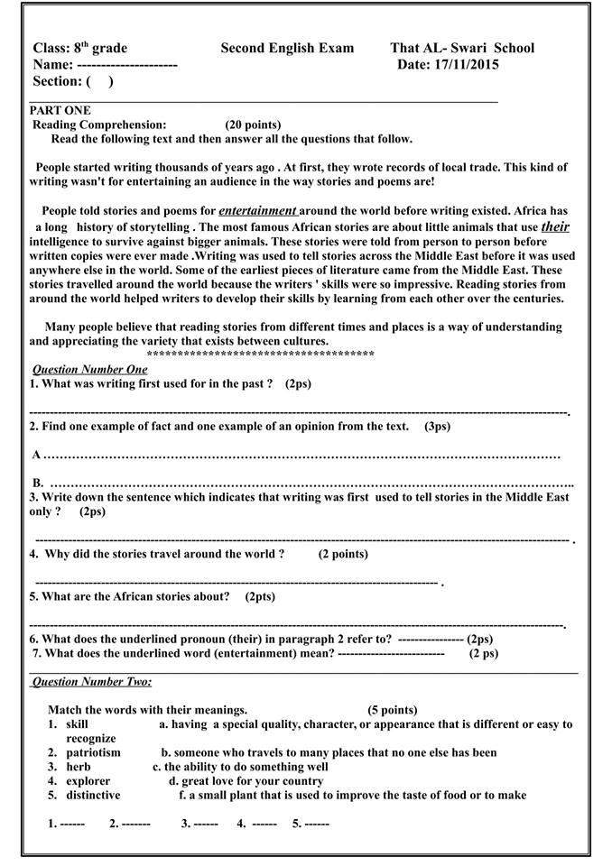 بالصور نموذج جديد لاختبار الشهر الثاني لمادة اللغة الإنجليزية للصف الثامن الفصل الأول