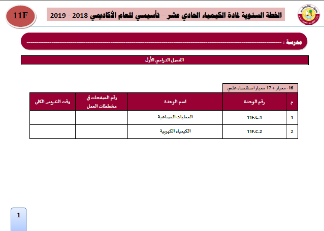 الخطه السنويه لمادة الكيمياء لصف الحادي عشر تأسيسي الفصل الأول المنهاج القطري 2018 - 2019
