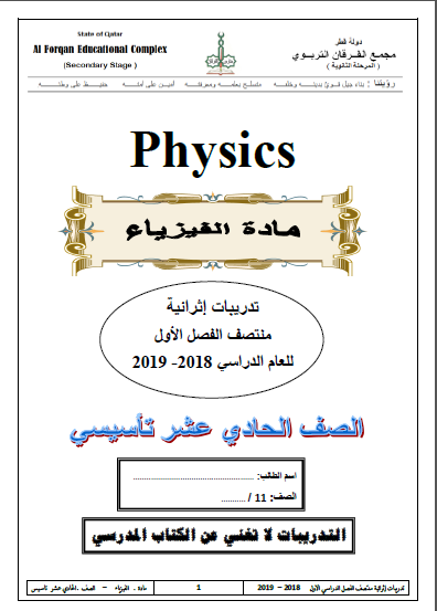 تدريبات اثرائيه لمادة الفيزياء الصف الحادي عشر تأسيسي الفصل الأول المنهاج القطري 2018 - 2019