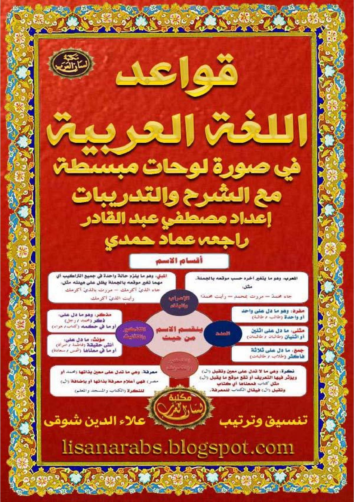 كتاب يحتوي على 139 صفحة قواعد اللغة العربية في صورة لوحات مبسطة مع الشرح والتدريب لجميع المراحل التدريسية