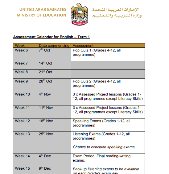 اللغة الإنجليزية (Assessment Calendar for English – Term 1) للصف الأول حتى الثاني عشر