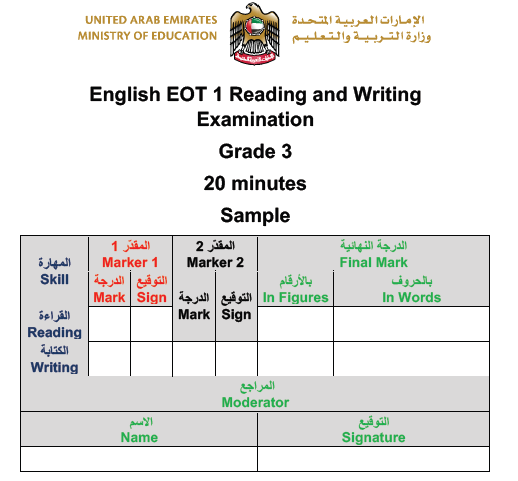 English EOT 1 Reading and Writing Examination Grade 3- 20 minutes Sample