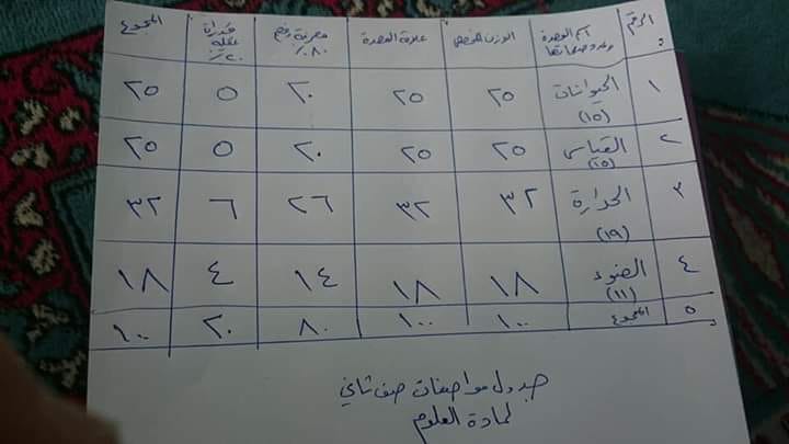 جدول مواصفات لمادة العلوم للصف الثاني الفصل الأول