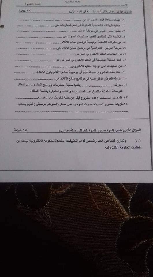 بالصور :. نموذج للاختبار النهائي لمادة الحاسوب للصف التاسع الفصل الأول