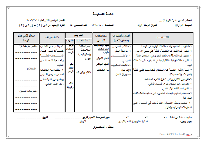 نموذج Word الخطة الفصلية + تحليل المحتوى لمادة الجغرافيا للصف الاول الثانوي المستوى الثاني الفصل الثاني 2019