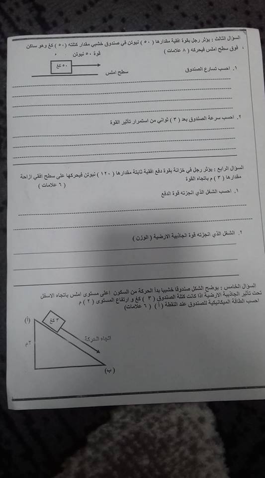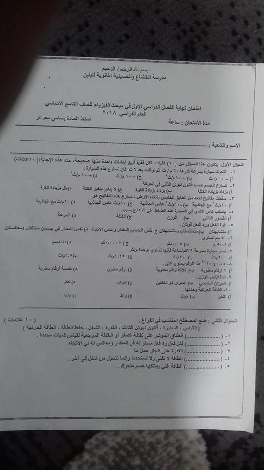 نموذج للاختبار النهائي لمادة الفيزياء للصف التاسع الفصل الأول
