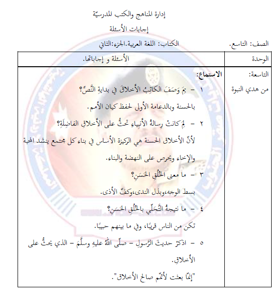 جميع اجابات مادة اللغة العربية مهارات الاتصال الصف التاسع الفصل الثاني