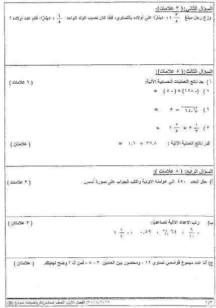 نماذج وكالة:الاختبار النهائي لمادة الرياضيات للصف السادس الفصل الاول