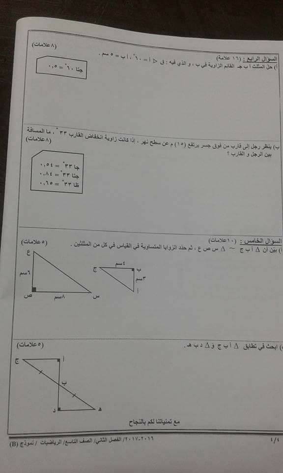 وكالة :نموذج للاختبار النهائي لمادة الرياضيات للصف التاسع الفصل الأول