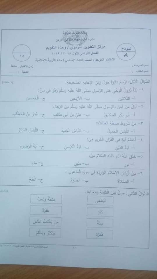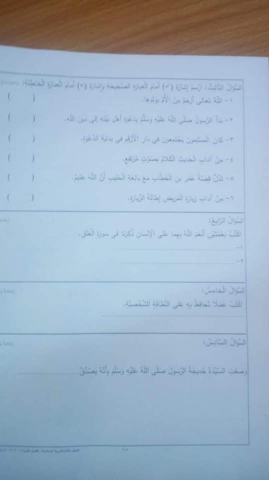بالصور :. وكالة :الاختبار النهائي لمادة التربية الإسلامية للصف الثالث الفصل الأول