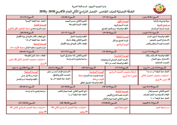 الخطه الفصليه لمادة اللغه العربيه الصف الخامس الأبتدائي الفصل الثاني