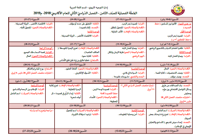 الخطه الفصليه لمادة اللغه العربيه الصف الثامن الفصل الثاني 2018 - 2019
