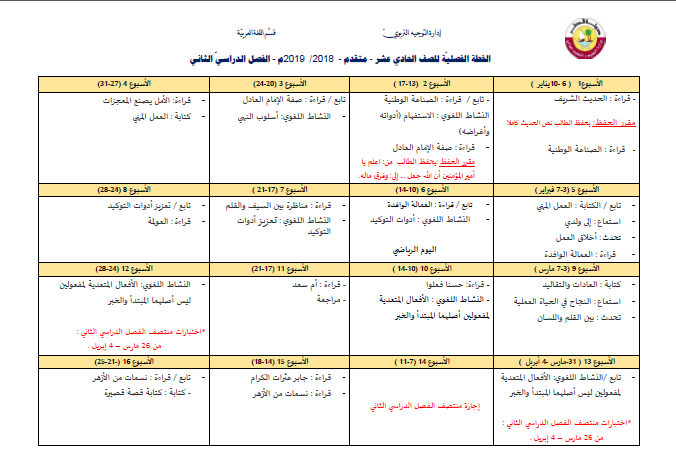 الخطه الفصليه لمادة اللغه العربيه الصف الحادي عشر متقدم الفصل الثاني المنهاج القطري