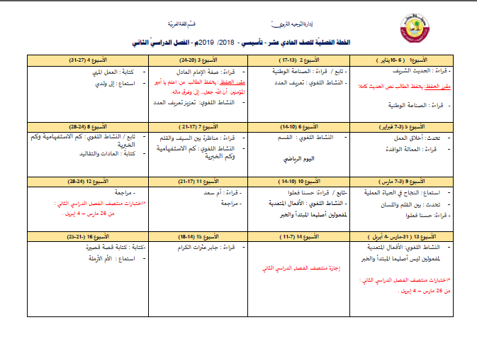 الخطه الفصليه لمادة اللغه العربيه الصف الحادي عشر تأسيسي الفصل الثاني 2018 - 2019