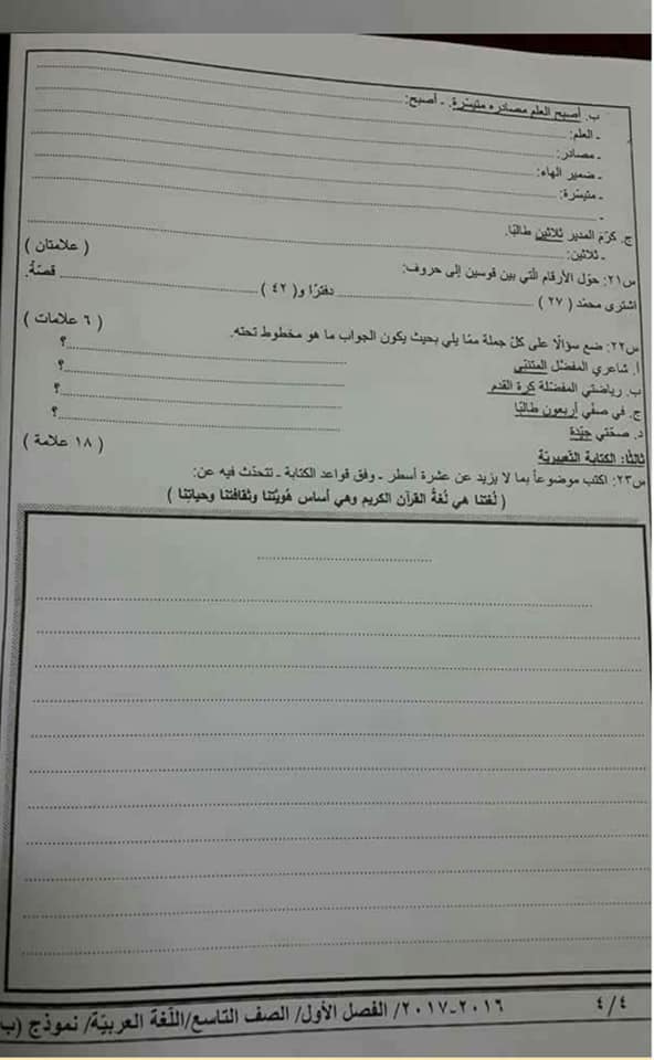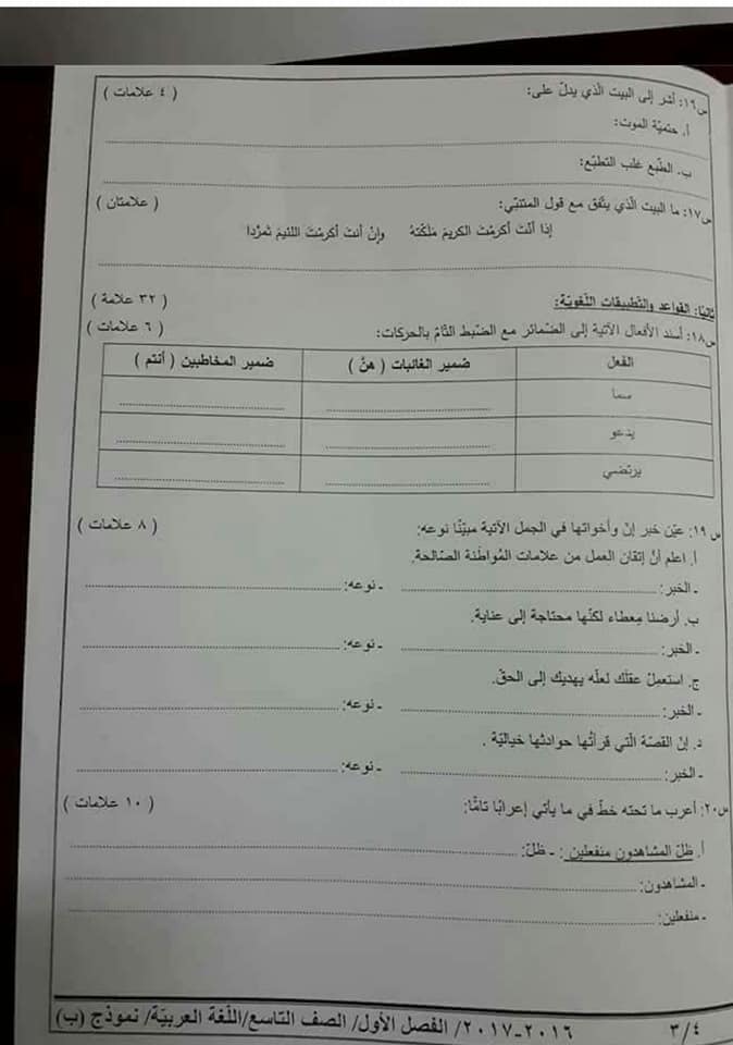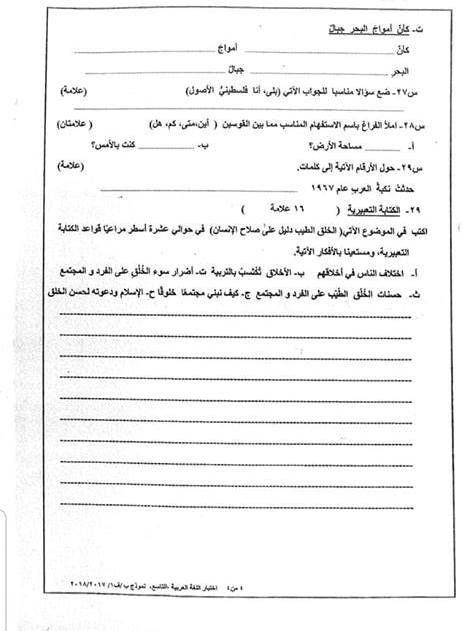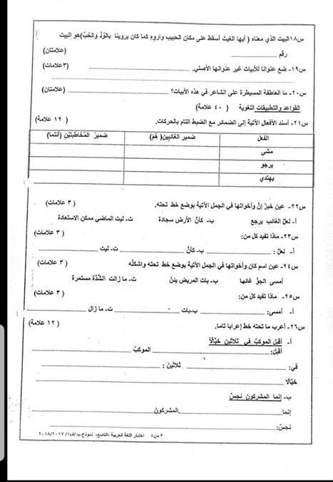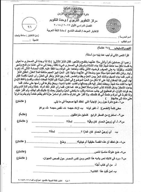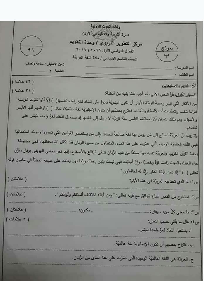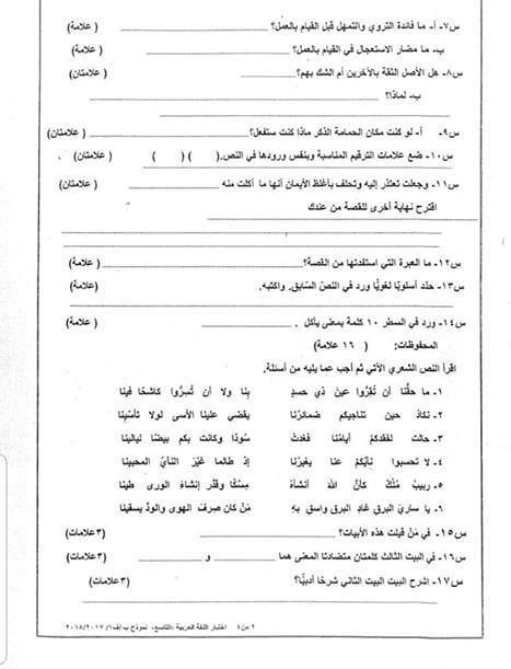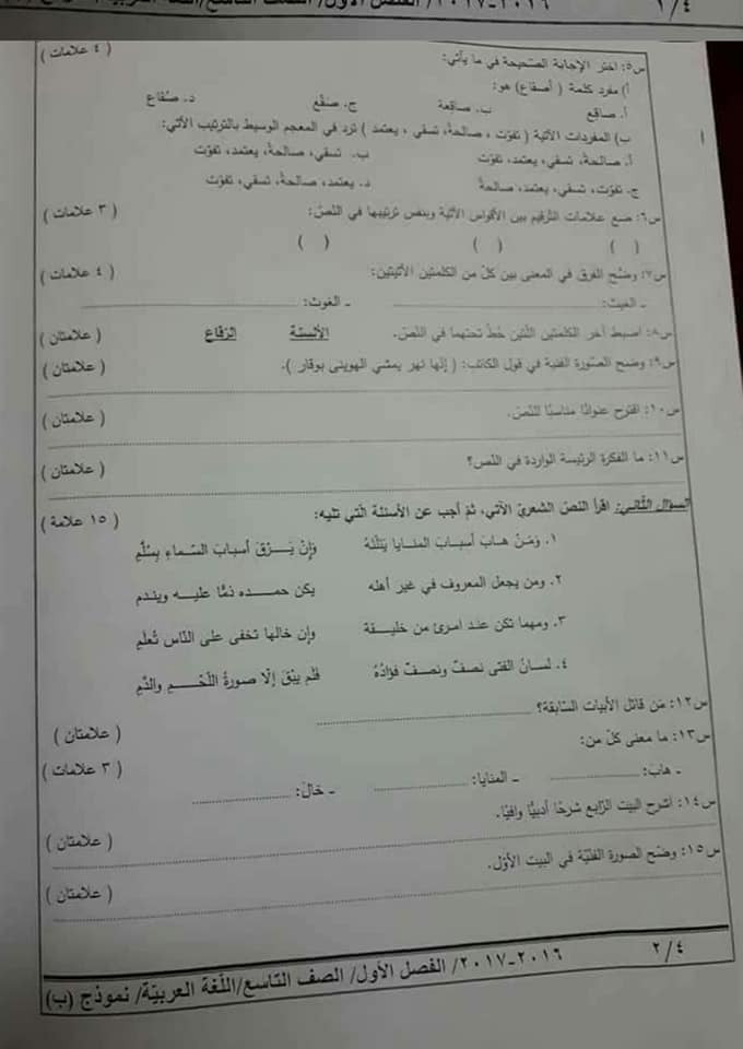 نموذج - 2 - نماذج متعددة وكالة الاختبار النهائي لمادة اللغة العربية للصف التاسع الفصل الأول