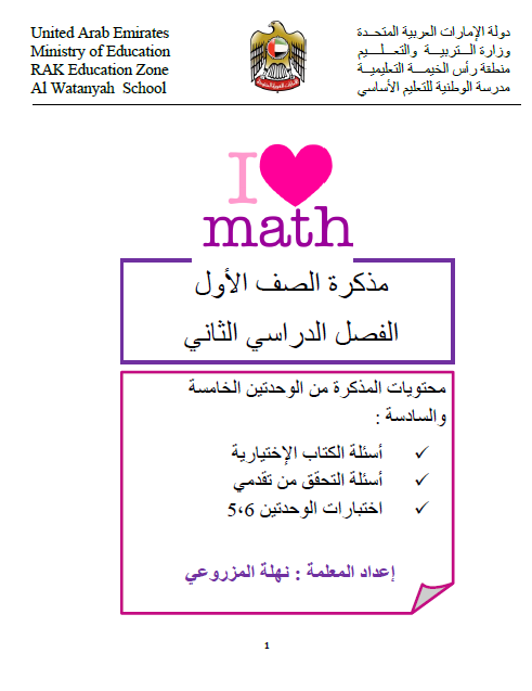 أوراق عمل واختبارات لمادة الرياضيات المتكاملة (الوحدتين الخامسة والسادسة) للصف الأول الفصل الثاني