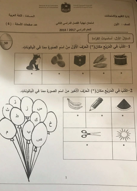 نموذج اختبار لمادة اللغة العربية الصف الاول الفصل الثاني اعوام سابقة