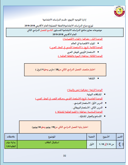 الخطة الفصلية لمادة الدراسات الاجتماعية الصف التاسع الفصل الثاني لتحميل الملف PDF اضغط هنا وتابع