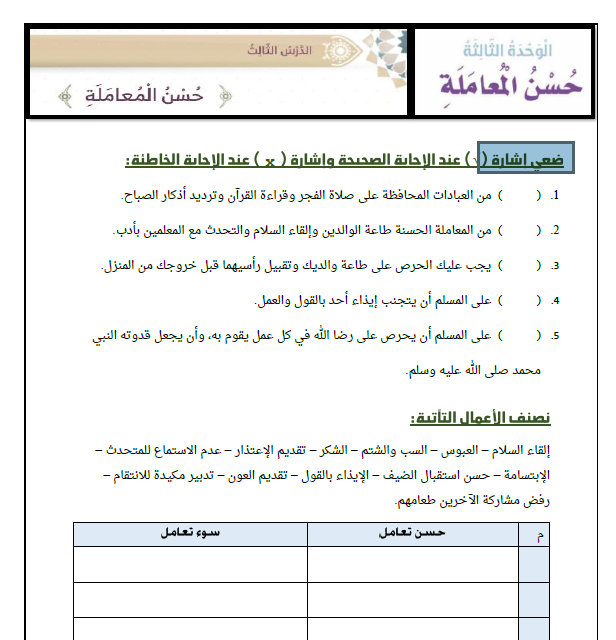 ورقة عمل (حسن المعاملة) لمادة التربية الإسلامية للصف الرابع الفصل الثاني