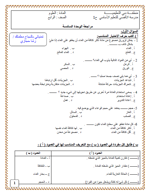 مراجعة الوحدة السادسة ( المادة ) لمادة العلوم الصف الرابع الفصل الثاني