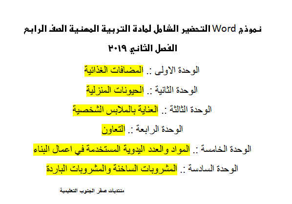 نموذج Word التحضير الشامل لمادة التربية المهنية الصف الرابع الفصل الثاني