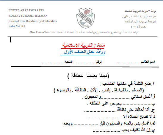 نموذج Word ورقة عمل ديننا يعلمنا النظافة لمادة التربية الاسلامية الصف الاول الفصل الثاني