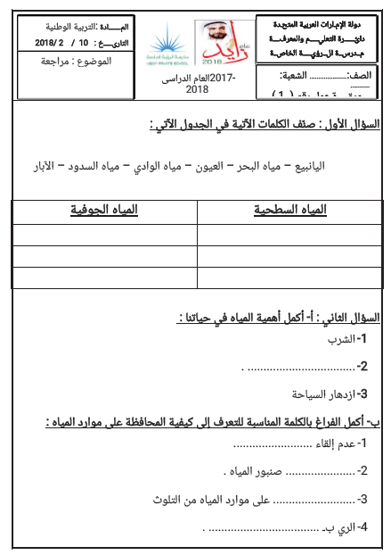 اوراق عمل مراجعة لماده الدراسات الاجتماعيه والتربيه وطنيه للصف الثاني الفصل الثاني لتحميل الملف PDF اضغط هنا وتابع