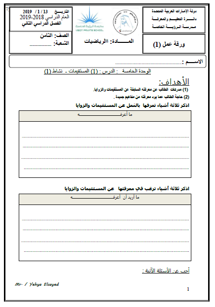 ورقة عمل الوحدة الخامسة الدرس الاول المستقيمات لماده الرياضيات للصف الثامن الفصل الثاني