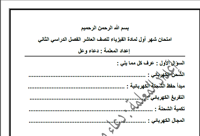 نموذج امتحان الشهر الاول لمادة الفيزياء للصف العاشر الفصل الدراسي الثاني 2019