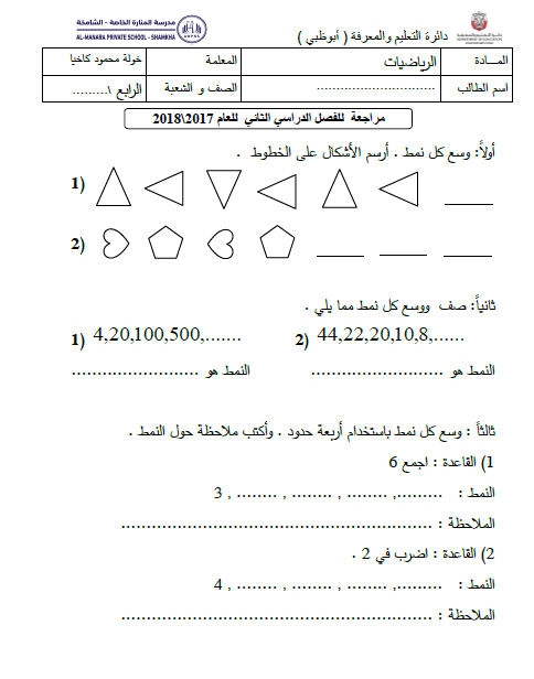 اوراق عمل مراجعة لماده الرياضيات للصف الاول الفصل الاول لتحميل الملف PDF اضغط هنا وتابع