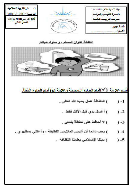 ورقة عمل النظافة لماده التربية الاسلاميه للصف الاول الفصل الثاني لتحميل الملف PDF اضغط هنا وتابع