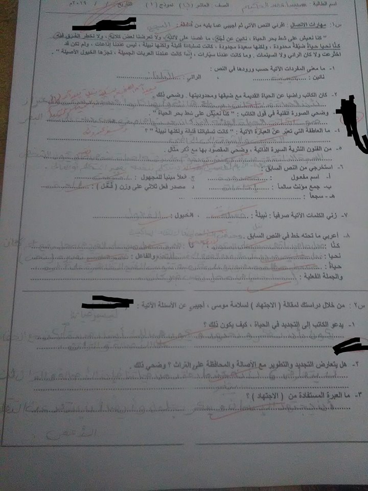 نموذج جديد اختبار الشهر الأول لمادة اللغة العربية للصف العاشر الفصل الثاني