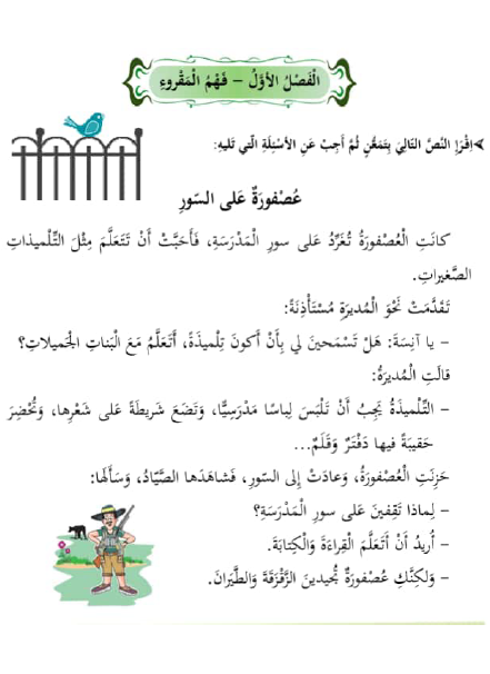 ورقة عمل فهم واستيعاب عصفورة عيل السور لماده اللغة العربية للصف الثاني الفصل الثاني لتحميل الملف PDF اضغط هنا وتابع